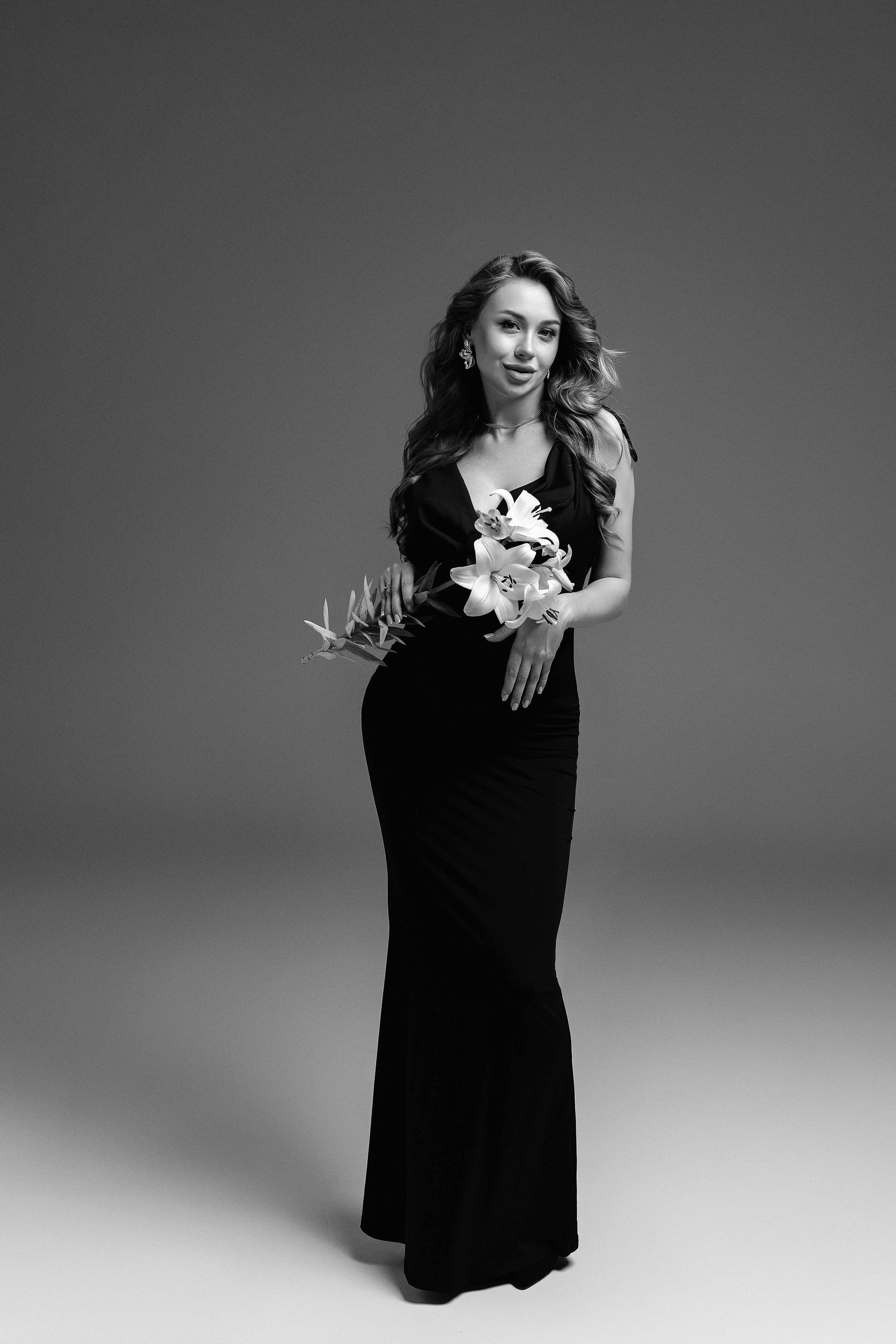 Чистый силуэт акцентирует линии тела, образ выглядит выразительно и элегантно в студийной съёмке. Платье подходит до 46 размера.