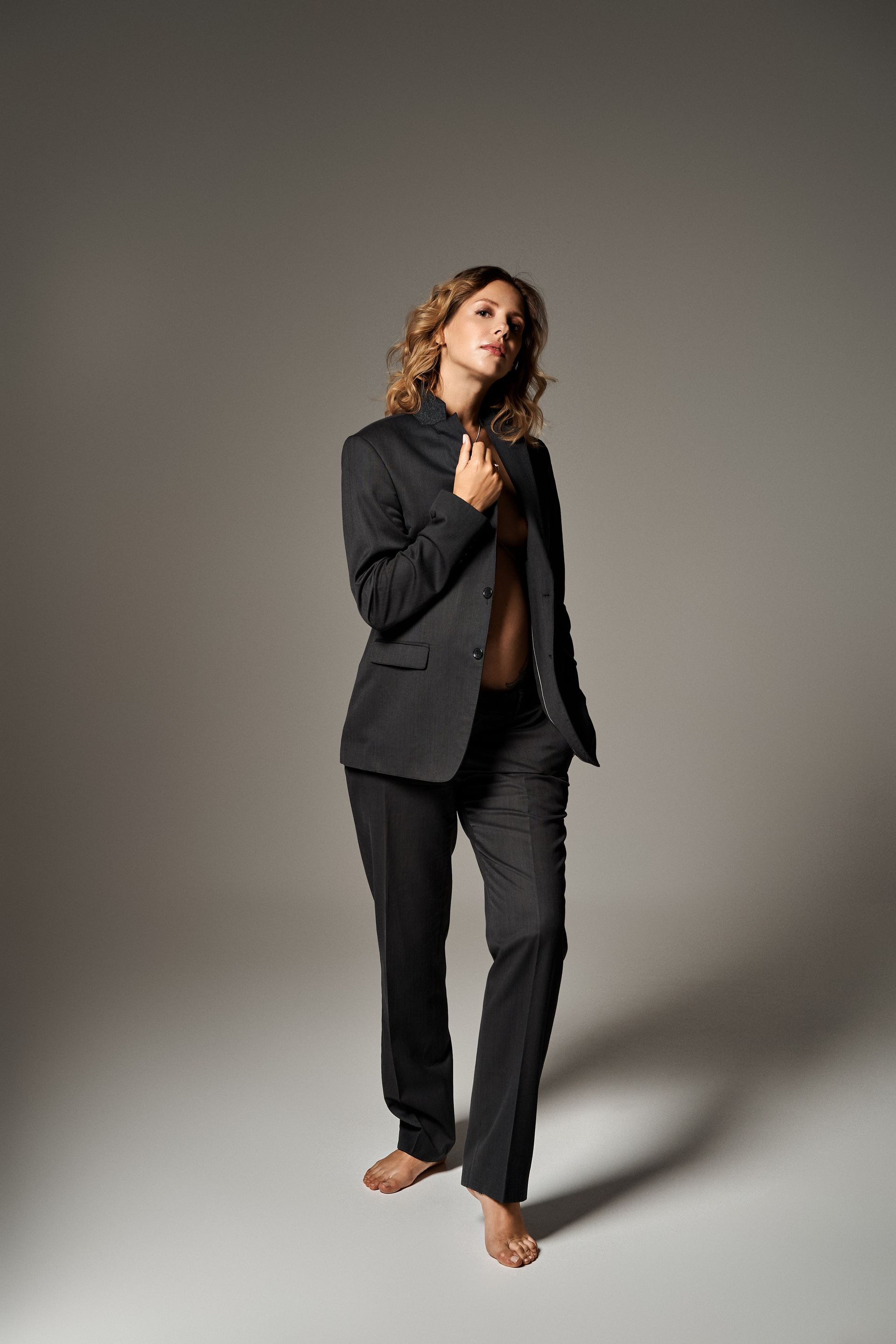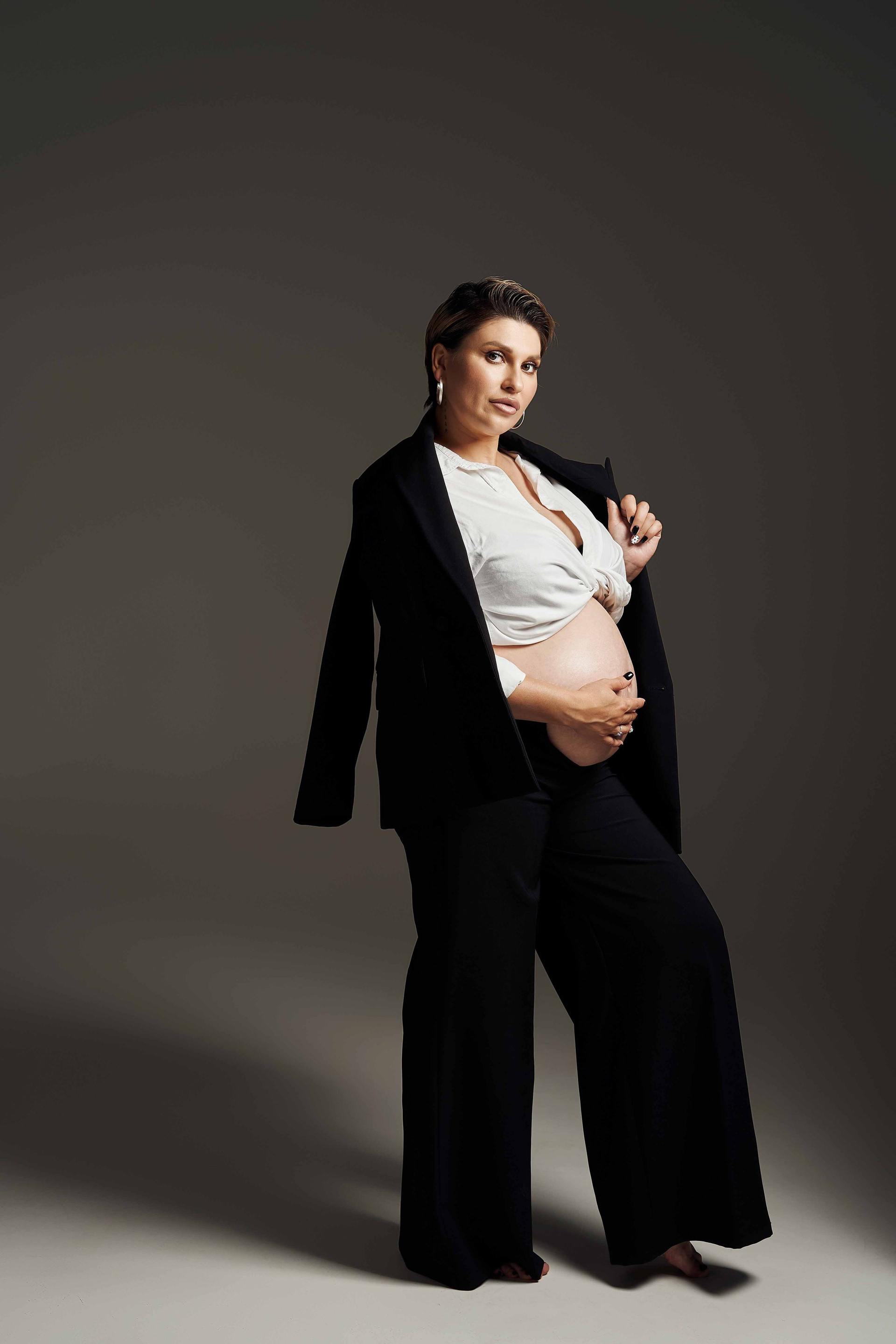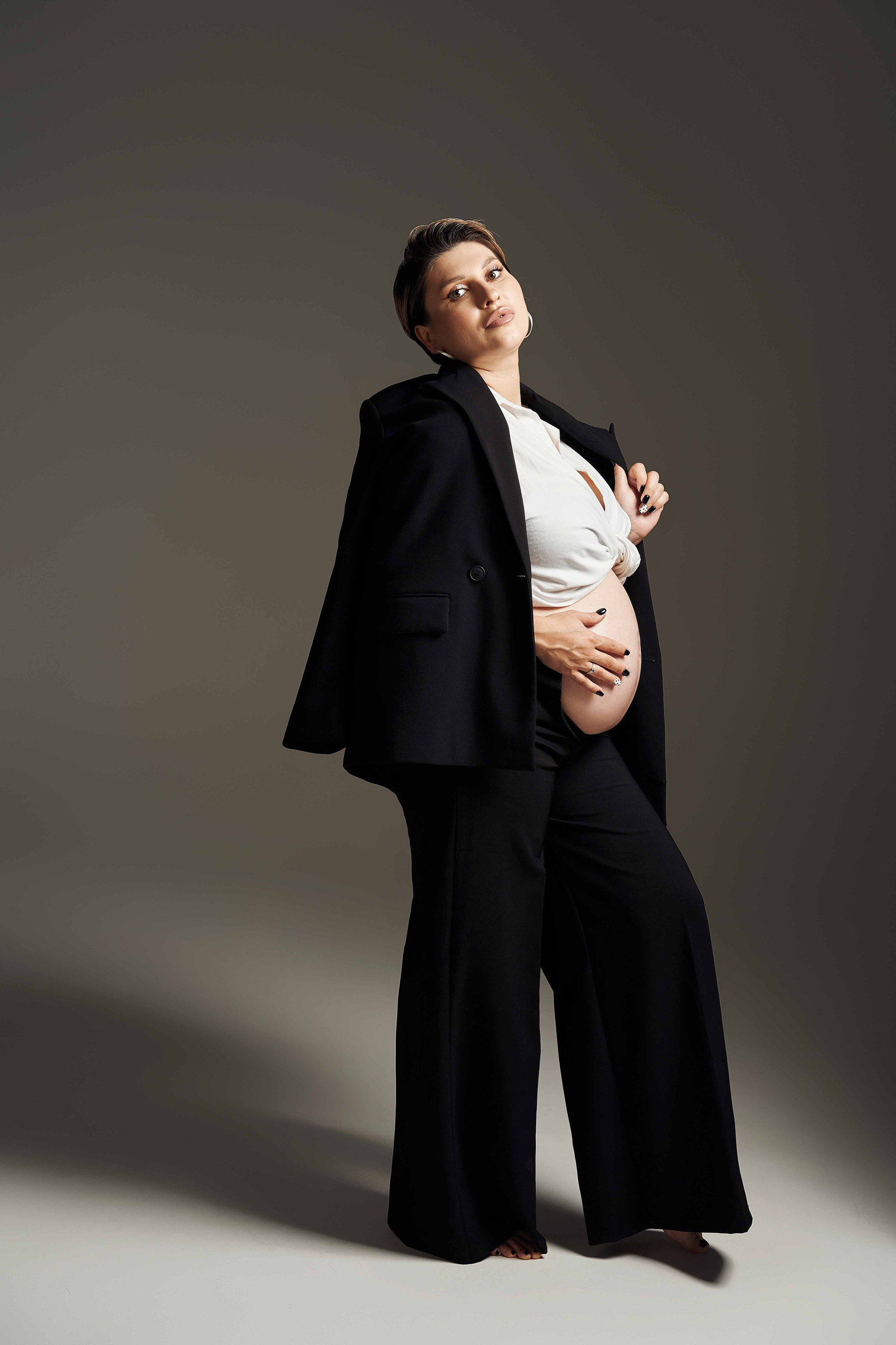 Классический костюм мужского кроя в чёрно-сером оттенке, который эффектно адаптируется под беременный животик, позволяя красиво его подчеркнуть и оголить.