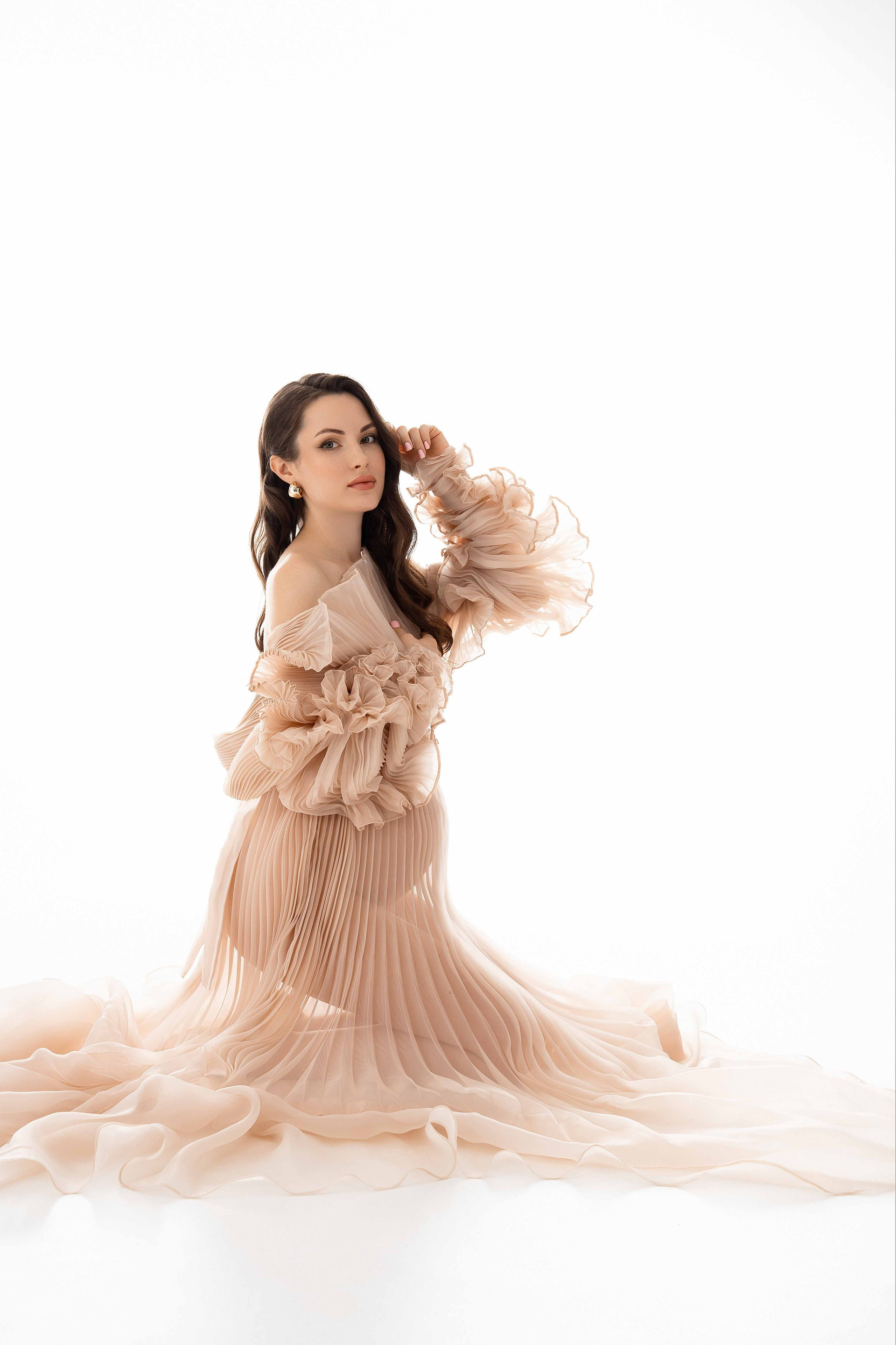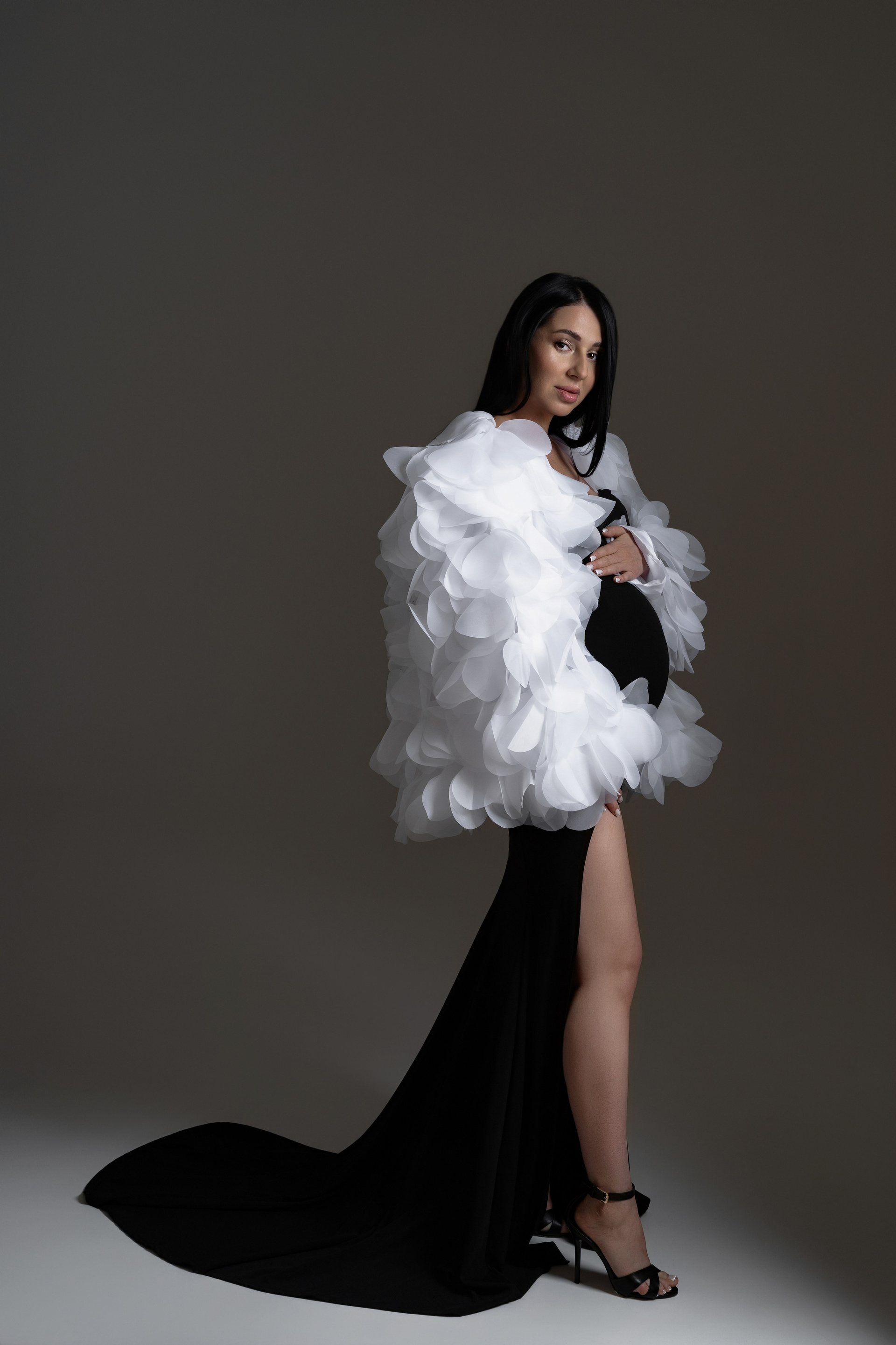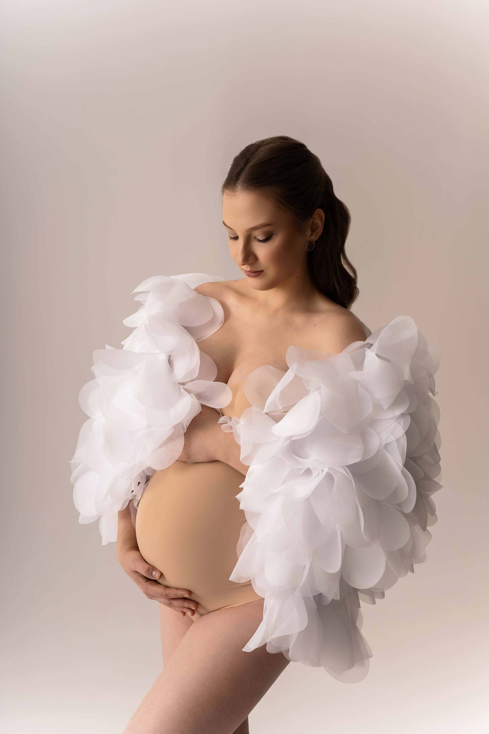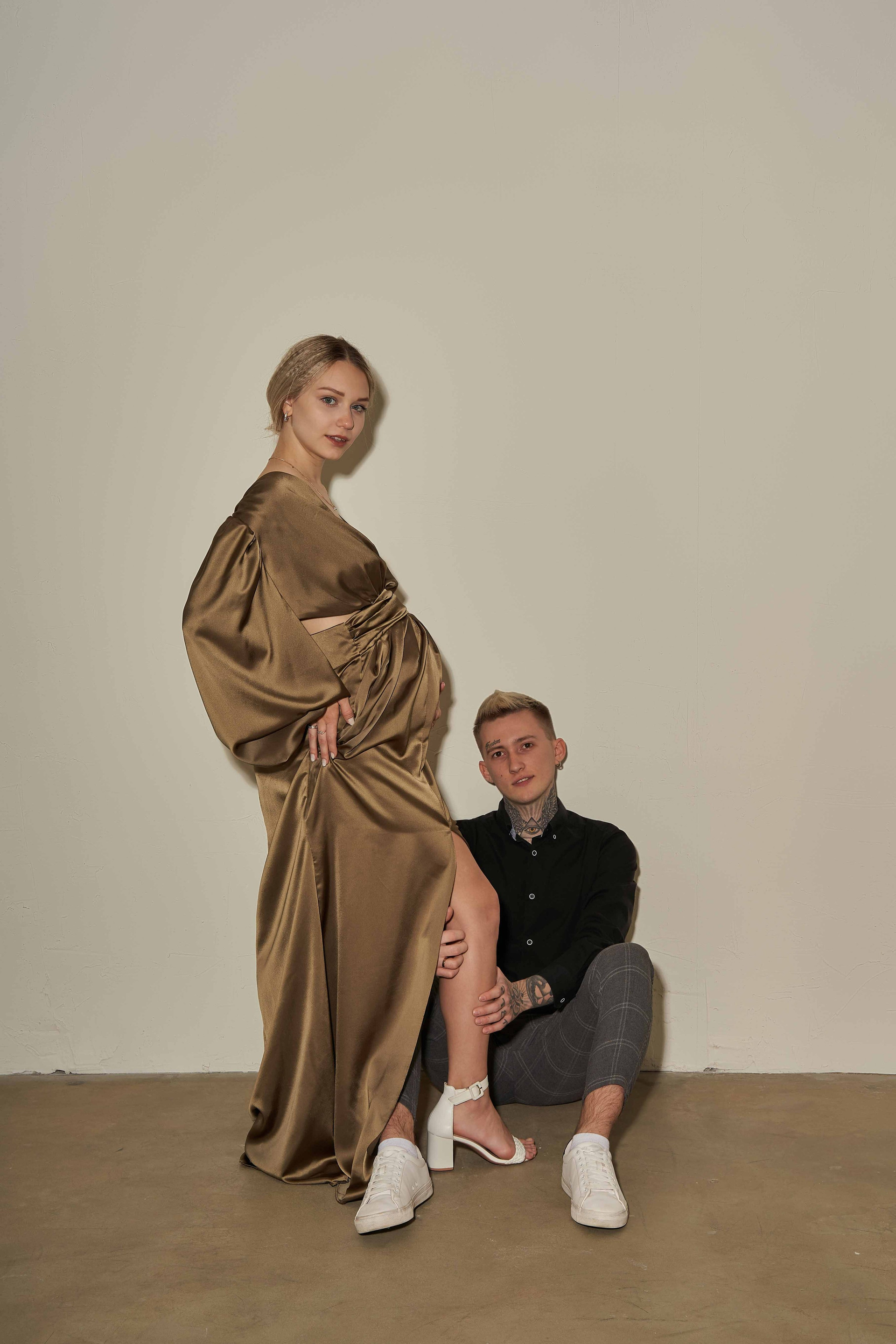 Её можно надевать поверх обтягивающего платья, на голое тело с акцентом на беременный животик или сочетать с боди бежевого оттенка. Образ дополняют серьги и колье в виде цветка, которые есть в наличии и делают кадры особенно эффектными и цельными.