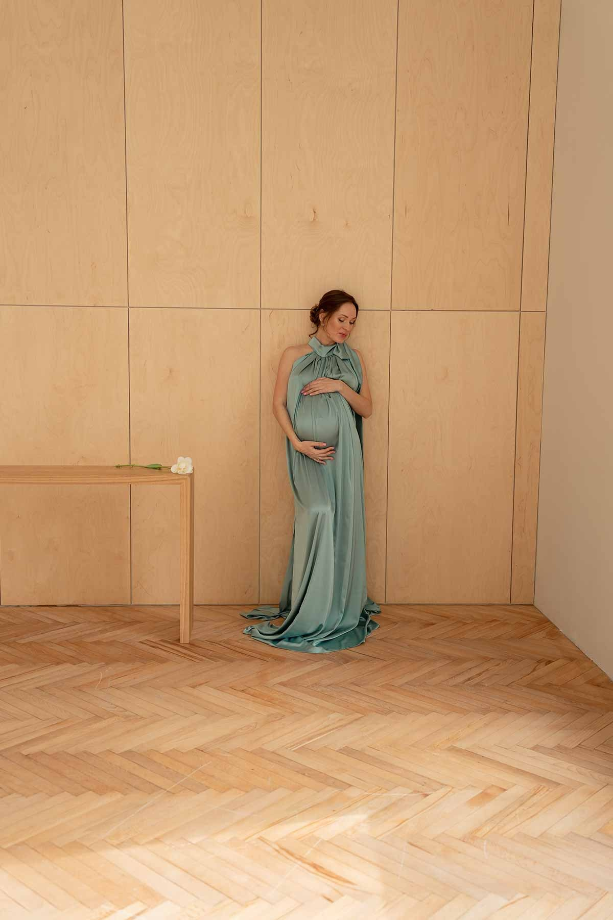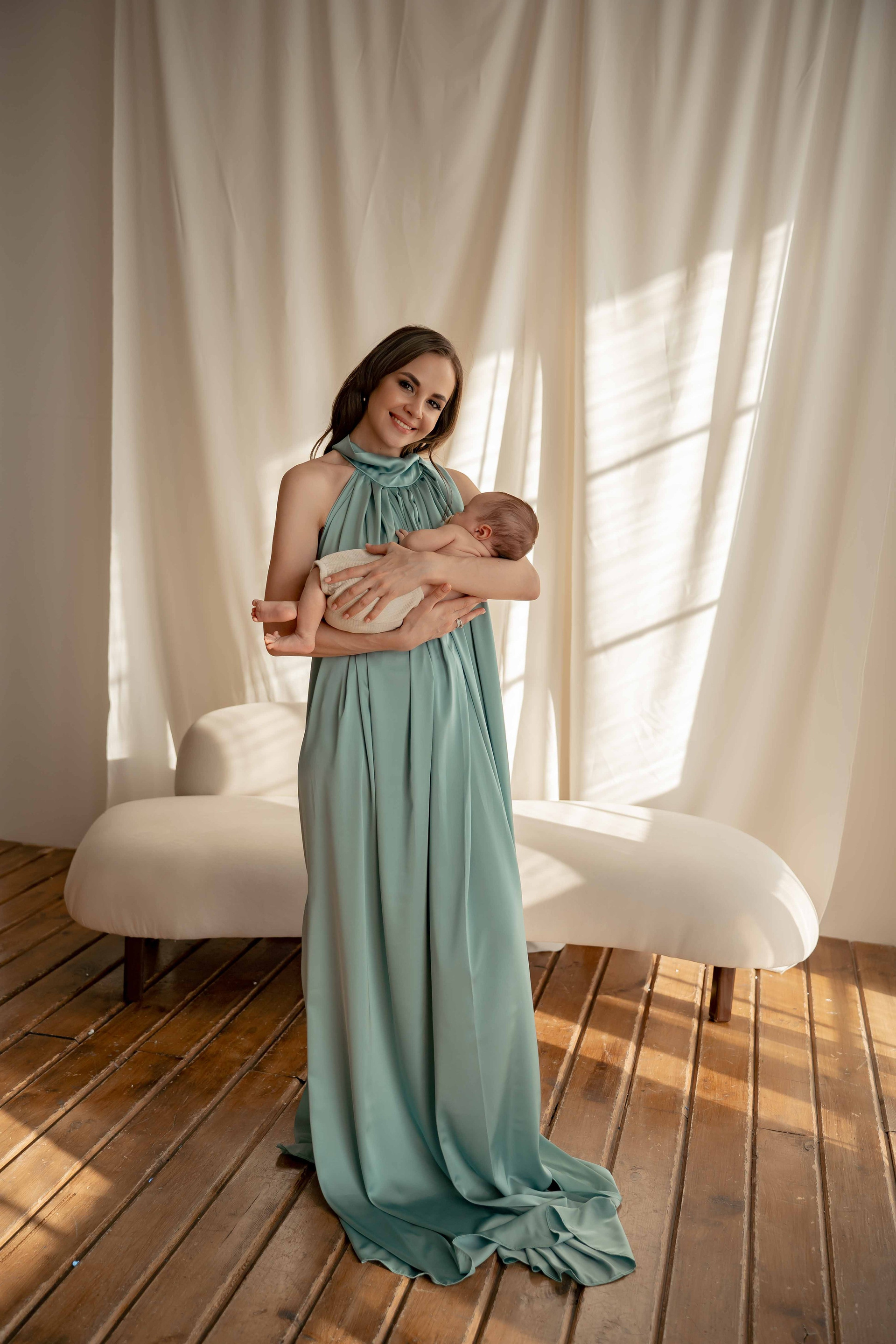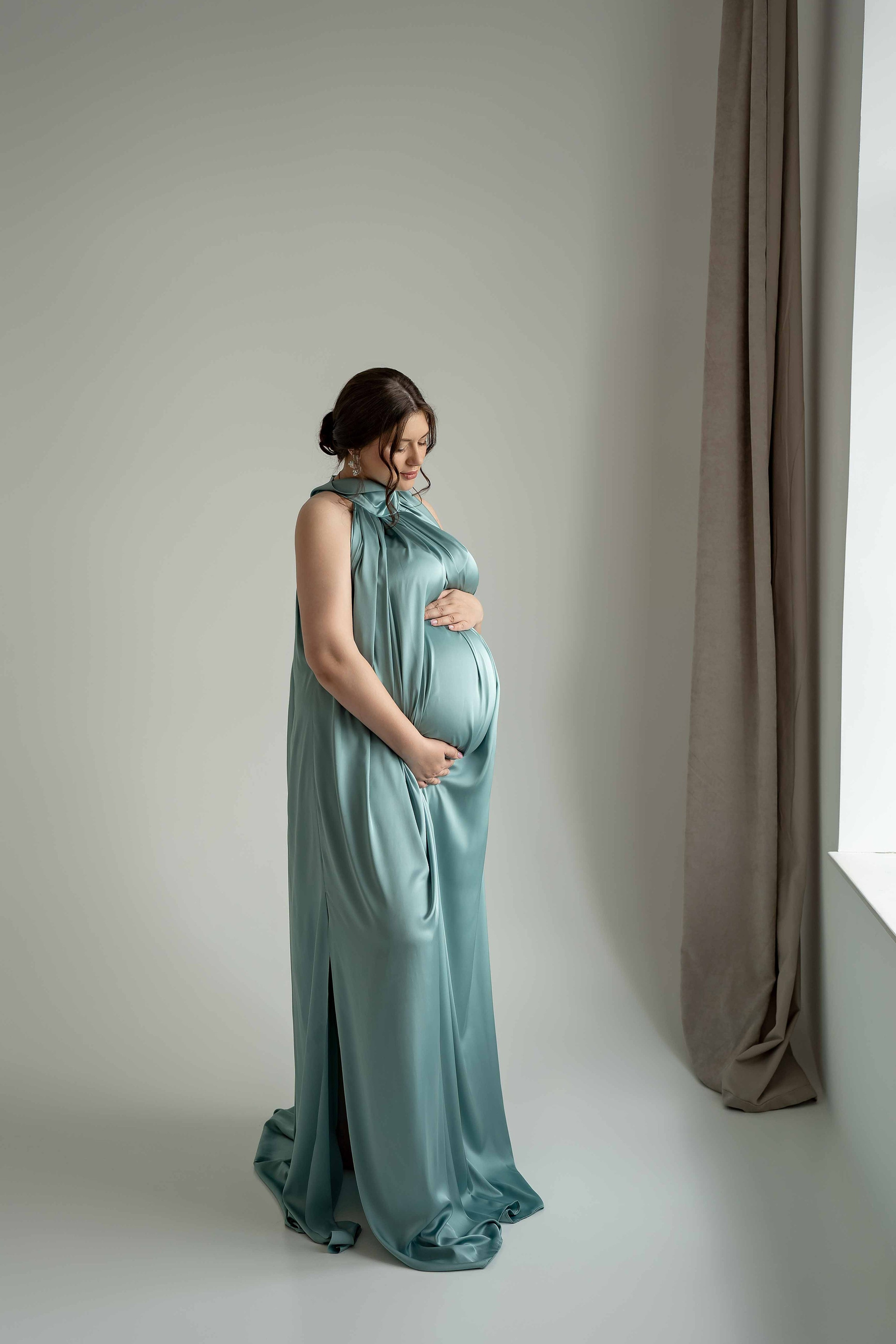 Модель красиво подчёркивает беременный животик, подходит девушкам 42–44 размера и раскрывается в кадре максимально легко и спокойно. Светлый голубой оттенок делает фотографии свежими и воздушными.