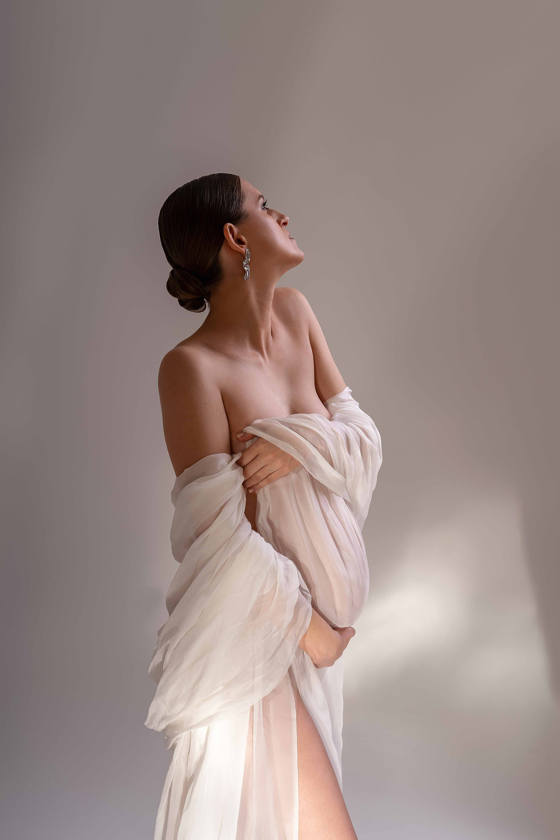 Модель подчёркивает утончённость фигуры, красиво ложится по телу и создаёт спокойный, элегантный образ в студийной съёмке. Подходит девушкам до 44 размера.Для съёмки рекомендуется гладкое бежевое бельё.